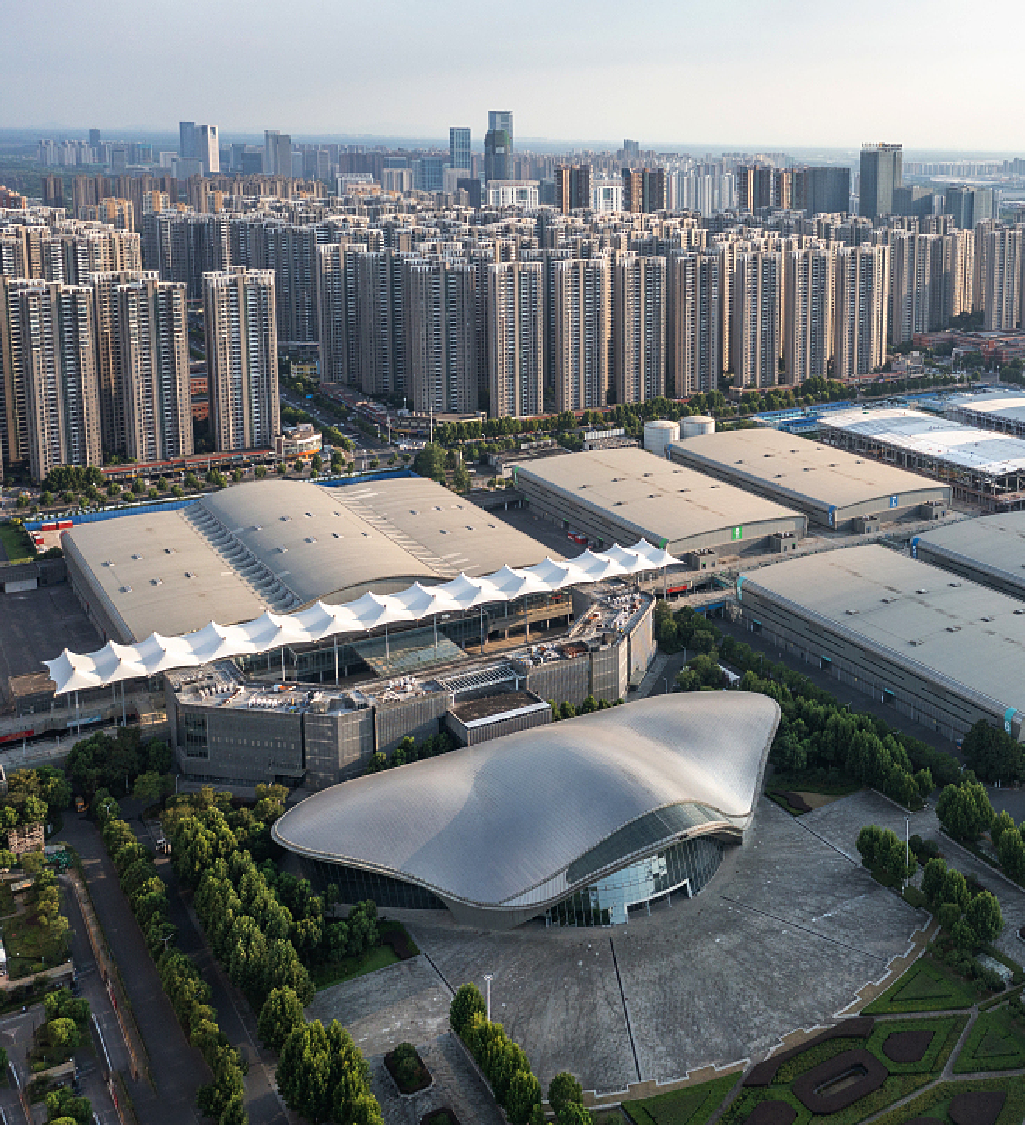 濱湖國際會展中心位于濱湖新區廬州大道與錦繡大道交口西南角,占地58.62公頃,總建筑面積約33.28萬平方米,建筑包括展...